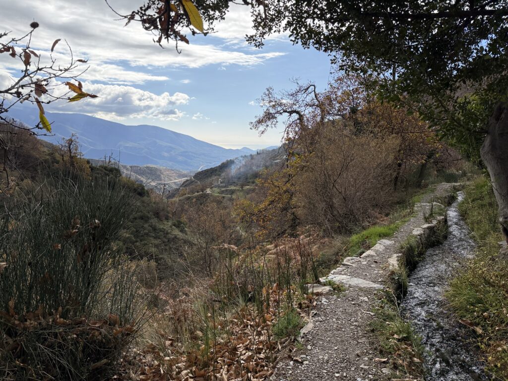 This hike around Lanjarón will beautifully showcase the area’s deep connection with water. On the western edge of the Alpujarra, an intricate network of ancient irrigation channels, the acequias, runs across the hillsides at different altitudes. Along these water channels, we’ll walk among chestnut and fruit trees, small gardens, and terraces filled with kiwis, cherries, figs, pomegranates, and vines.